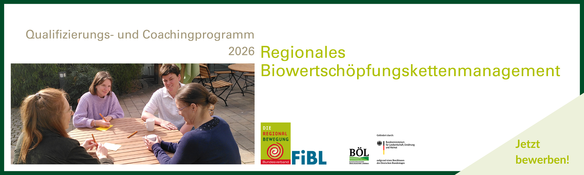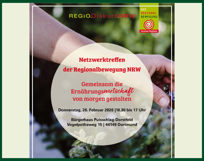 Bildnachweise: Titelbild: © Sabine Schürlein / Bundesverband der Regionalbewegung e.V., "Nahversorgung gemeinsam gestalten": © Andrea Winter / Bundesverband der Regionalbewegung e.V., "Nah versorgen – gut für morgen": © 1) Jana Berger 2) Simon Malik 3) Michael Fischer / Bundesverband der Regionalbewegung e.V., "Weiterbildung "Regionales Biowertschöpfungskettenmanagement" geht ab April 2026 in eine neue Runde": © FiBL, Medientipps "regioNAHlität - echt ehrlich essen auf Veranstaltungen": Titelbild: © Verena Dorn / Leitfaden: © Landkreis Oberallgäu / Stadt Kempten, Medientipps "GENUSS MIT VERANTWORTUNG": © Greentable e.V. - Initiative für Nachhaltigkeit in der Gastronomie, "Netzwerktreffen Landesverband Regionalbewegung NRW e.V.": © Landesverband Regionalbewegung NRW e.V., "5. DStGB-Regionalkonferenz": © Heinrich Helms / Bundesverband der Regionalbewegung e.V.